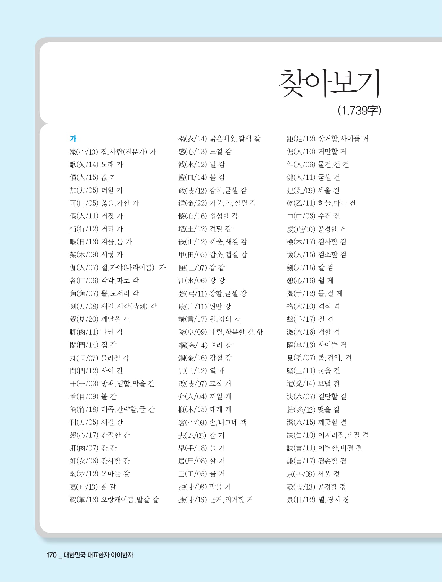 ∎교과서 한자 단어의 한자 1,739자를 가,나,다 순으로 찾아보기