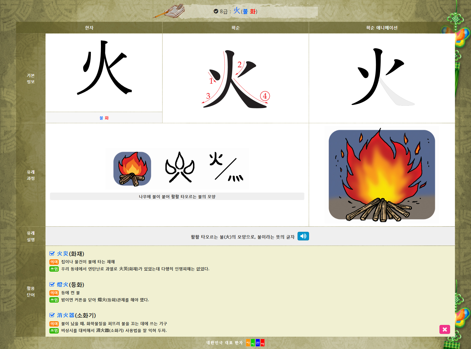 기본정보 : 훈.음, 부수 이미지, 중국어 듣기, 유래 설명, 활용 단어