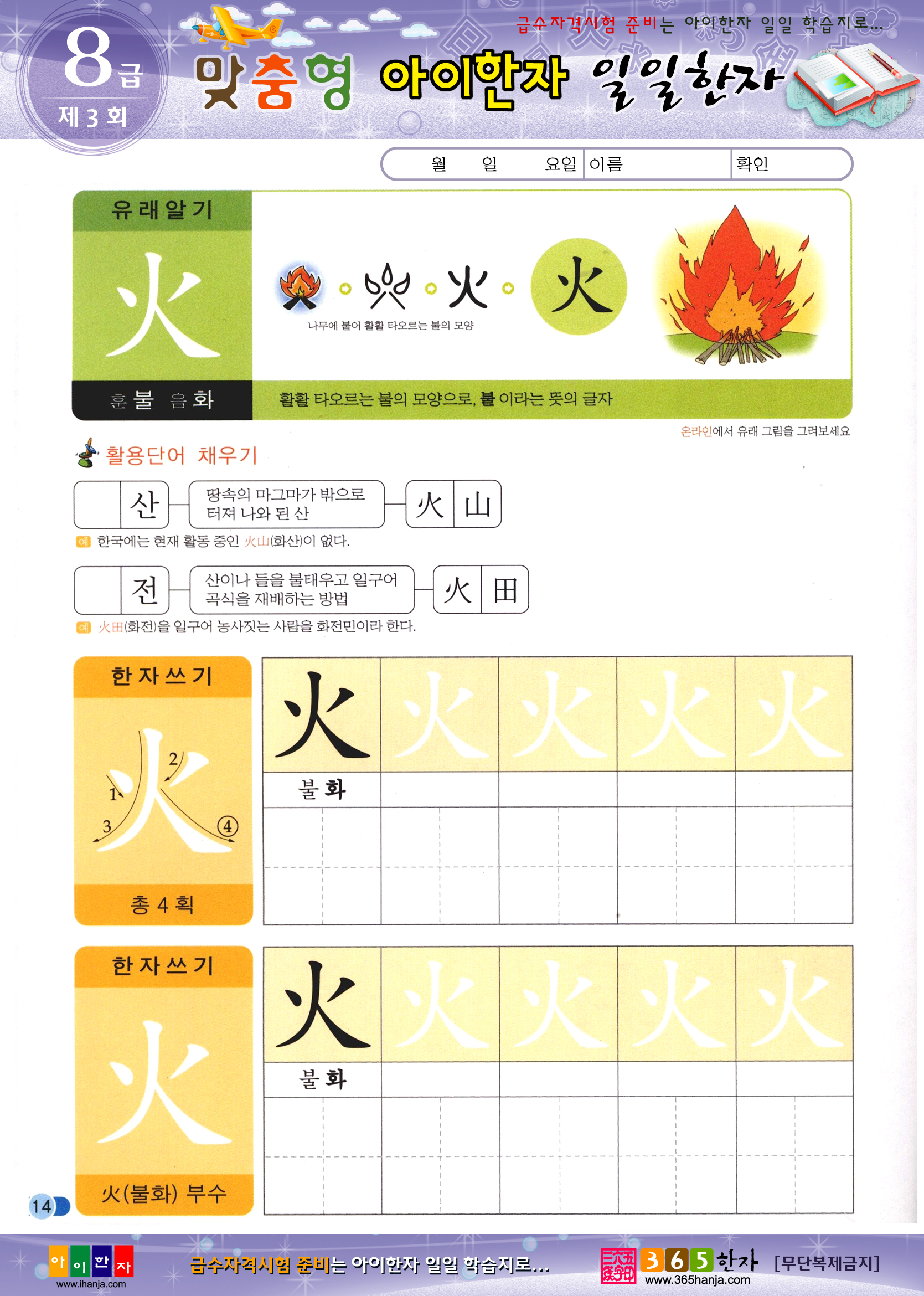 인쇄하기 :유래 과정, 유래 그림, 활용 한자, 활용 한자 풀이, 문장, 문장 만들기, 획순 보기, 따라 쓰기, 혼자 쓰기, 활용 한자 확인