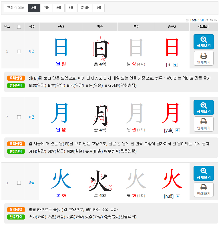상세보기 : 훈.음, 획순 보기, 획순 애니메이션, 유래 과정, 유래 그림, 유래 설명, 소리 듣기, 활용 단어 예문 보기