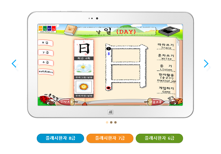 열린 플래시 한자를 클릭하여 좌측 및 하단에 있는 8급, 7급, 6급 메뉴를 선택하여 이용하시면 됩니다.